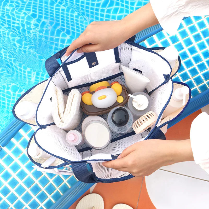 Une fermeture éclair permet de protéger les objets ranges dans le compartiment principal. De plus, le matériau en maille sèche rapidement et permet à l'air de circuler dans le sac, de sorte que vos serviettes humides ne sentiront pas mauvais après une longue journée à la plage.
